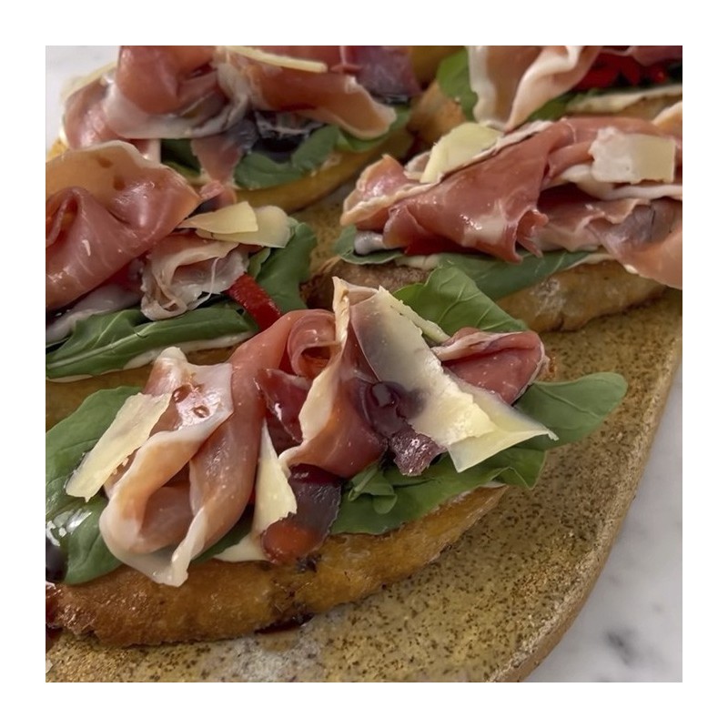 En esta ocasion la bruschetta española serrana, que contiene, queso manchego, jamon serrano y rucula, sobre pasta de ciboulette