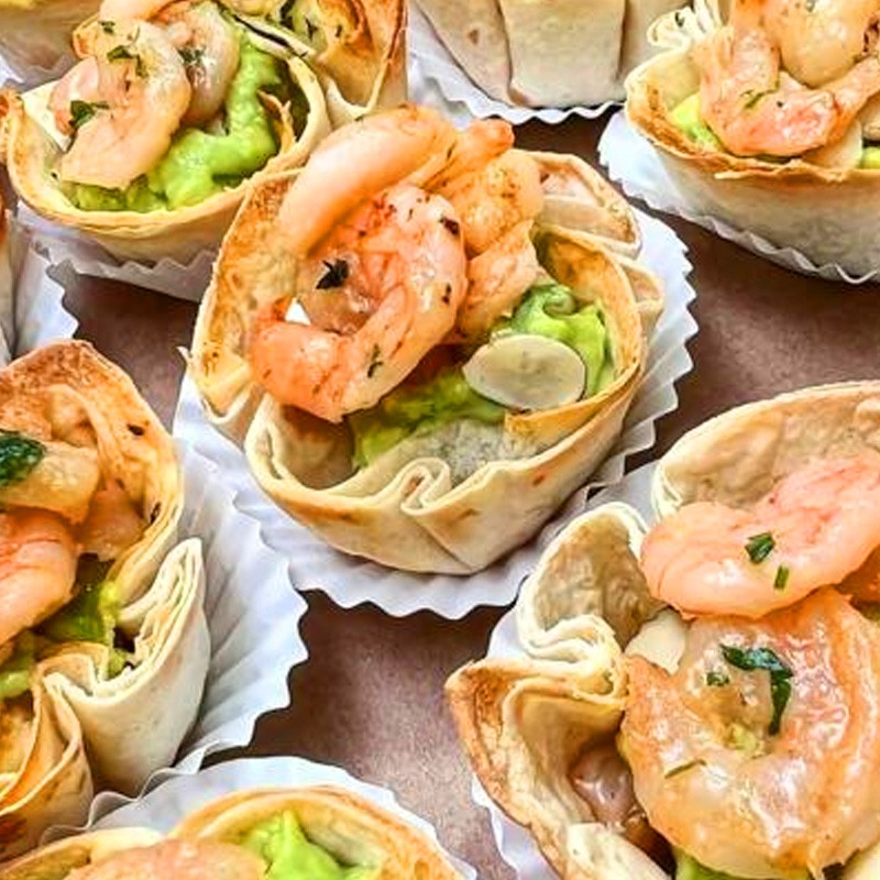 La canastita de camaron posee guacamole, pasta de pescado limon cebolla, lechuga, tomate, cancha.