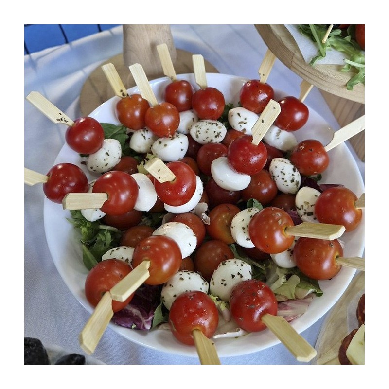 Este espectacular pincho de quesillo, cherrys, y una camilla de verduras verdes en aceite de oliva y ajo, sera la sensacion de tus eventos.