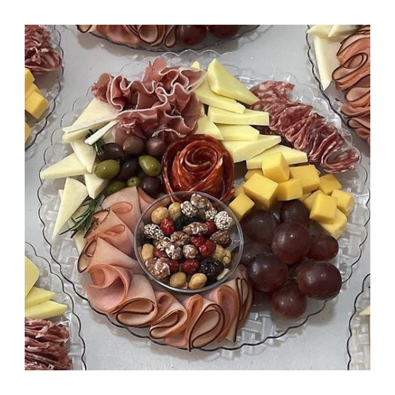 Contiene productos muy necesarios para tus eventos, tales como variados tipos de quesos, ademas de queso de cabra, salames, peperonis, aceitunas diversas, jamon acaramelado y jamon serrano frutos secos y un racimo de uvas.